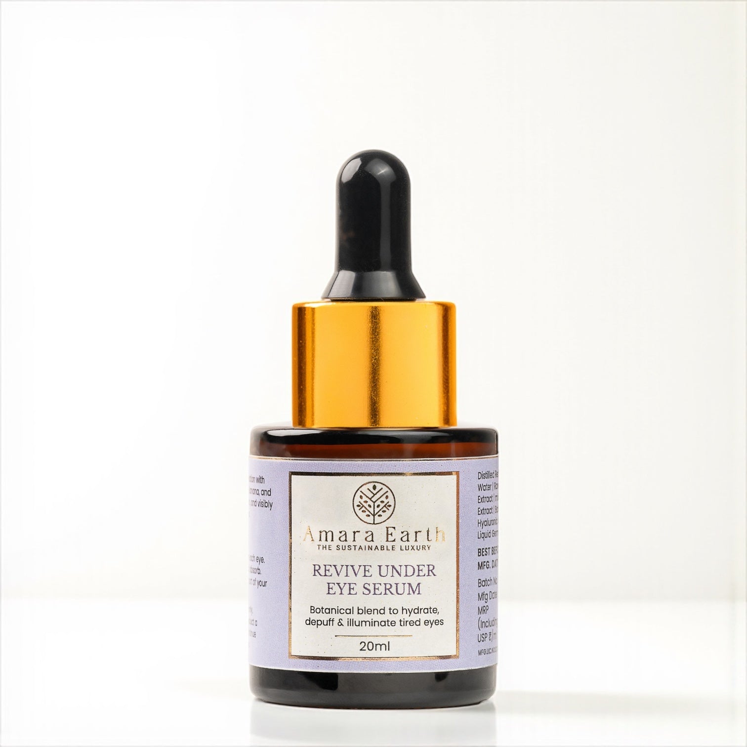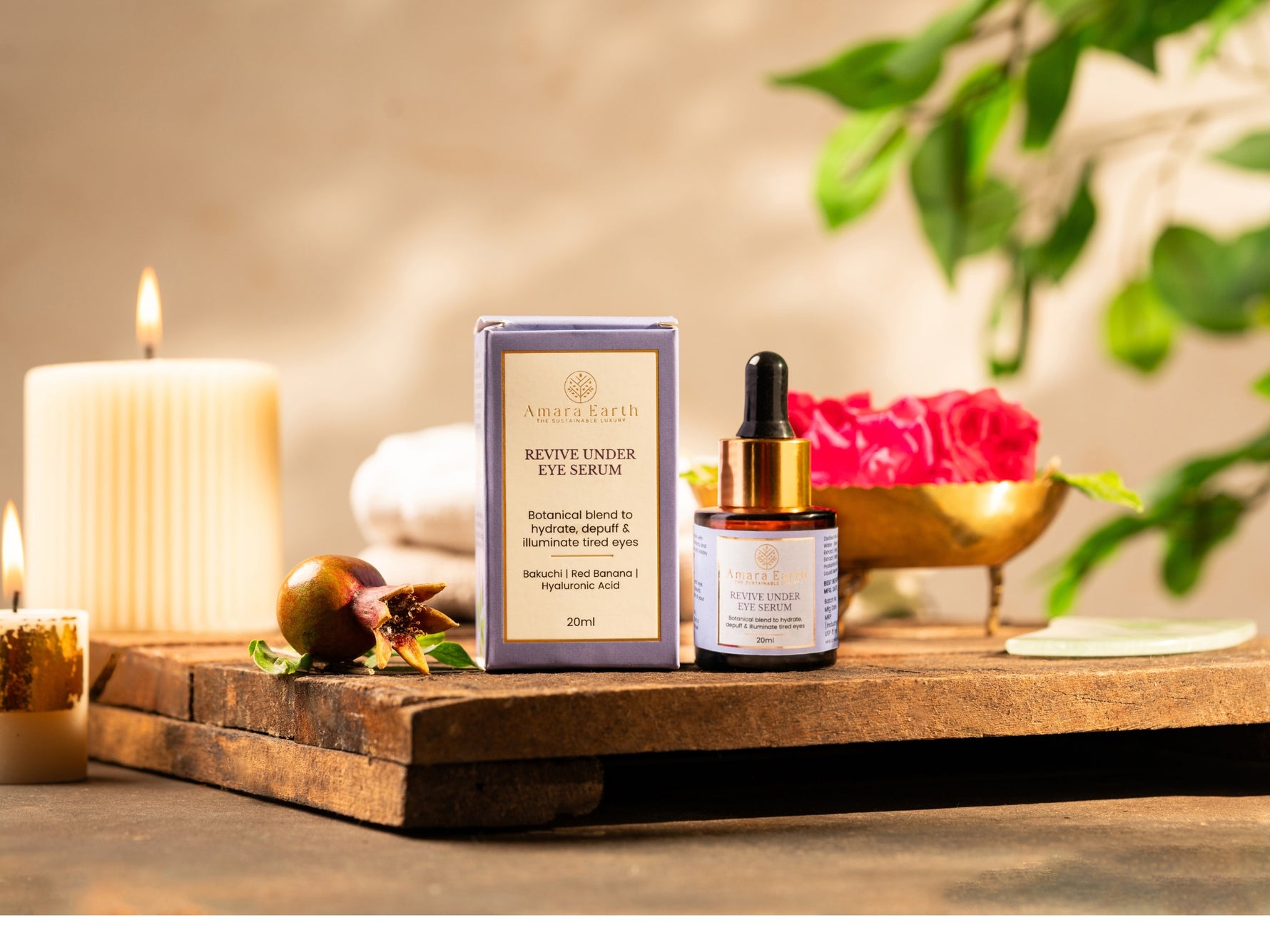 A lightweight, nourishing serum that refreshes and hydrates delicate under-eye skin. Enriched withBanana Extracts, Ashwagandha, Bakuchi Oil, Pomegranate Gel, and Hyaluronic Acid, it reduces puffiness, smooths fine lines, and brightens tired-looking eyes.Rose and Sandalwood Extracts soothe and calm, while Vitamin E provides antioxidant protection for visibly refreshed, radiant eyes.
